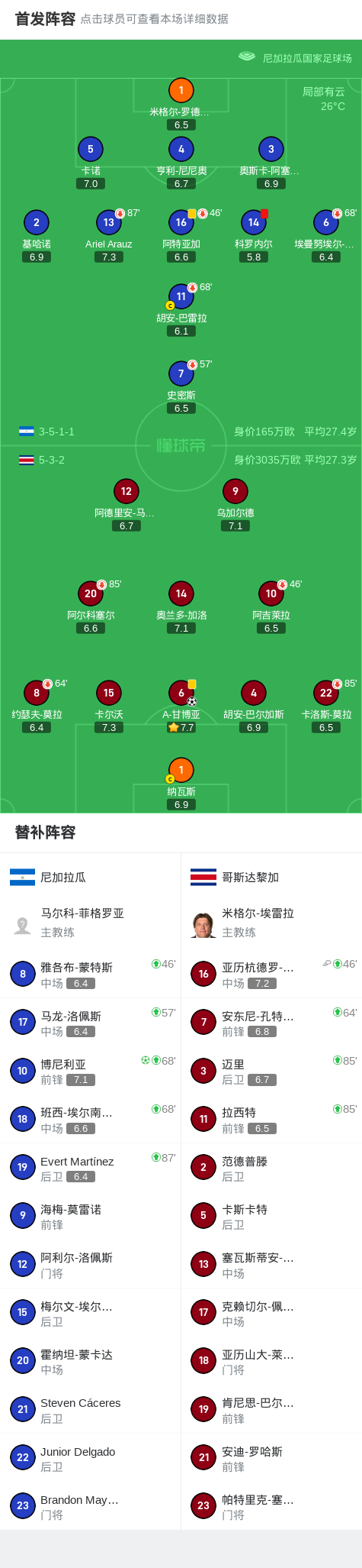 北京时间9月6日世界杯中北美洲区预选赛 第三阶段,尼加拉瓜对阵哥斯达黎加。尼加拉瓜博尼利亚破门。哥斯达黎加A-甘博亚破门。最终比分尼加拉瓜 1-1 哥斯达黎加。精彩瞬间第54分钟,尼加拉瓜球队科罗内尔吃到红牌。第60分钟,哥斯达黎加球员亚历杭德罗-布兰助攻A-甘博亚打入一球。第81分钟,尼加拉瓜球员博尼利亚罚入点球。球队阵容技术统计...